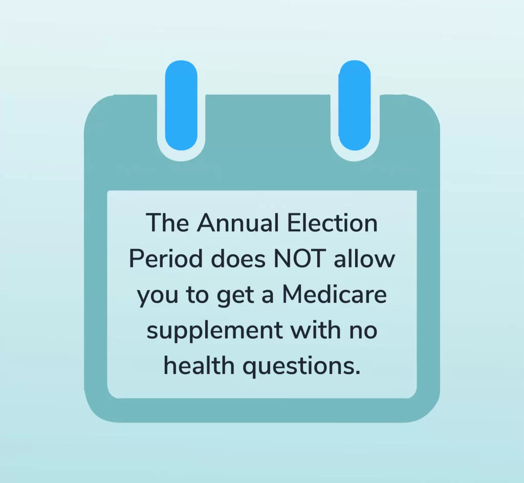 Many people mistakenly believe that the Annual Election Period (AEP) in the fall from October 15th thru December 7th each year is a time when you can change Medicare Supplement plans with no health questions. This is not the case and a common mistake with seniors.The Annual Election Period (AEP) in the fall pertains only to your Part D plan, not your Medicare Supplement plan.